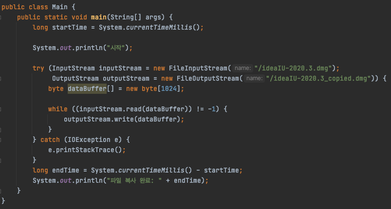 다른 하나는 바이트의 배열을 통해 읽어들이고 읽어들인 바이트 배열을 써나가는 메소드를 사용해볼 것이다