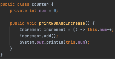 위의 예제를 보면 람다식 내부에서 num 의 값을 변경하고 있음에도 컴파일러가 오류를 띄우지 않고 있다