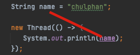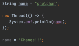 그렇기 때문에 람다식에서 지역변수를 참조하기 위해서는 참조하는 지역변수가 final 이거나 effectively final 이어야 한다